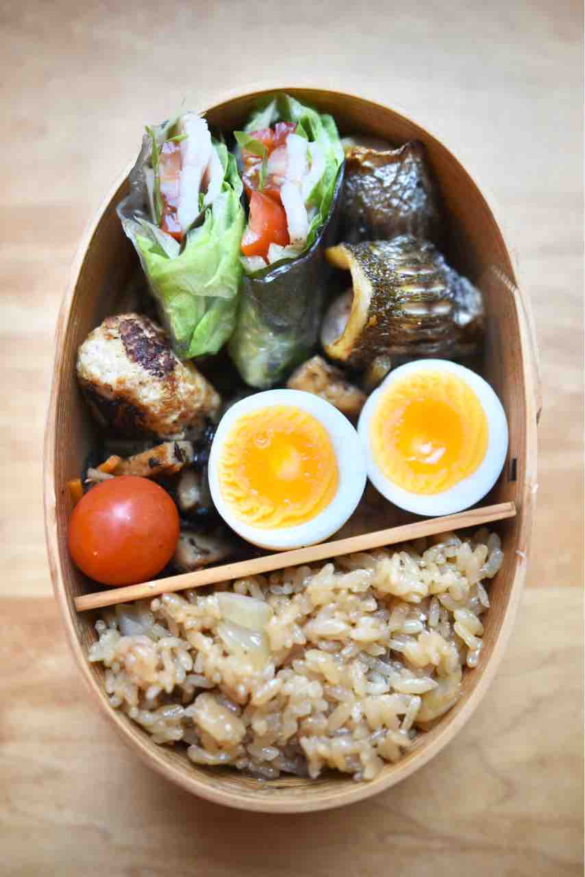 鶏ハムの生春巻き、イサキの幽庵焼き、鶏つくね焼き、半熟玉子、ひじき煮、ミニトマト、鶏飯。
