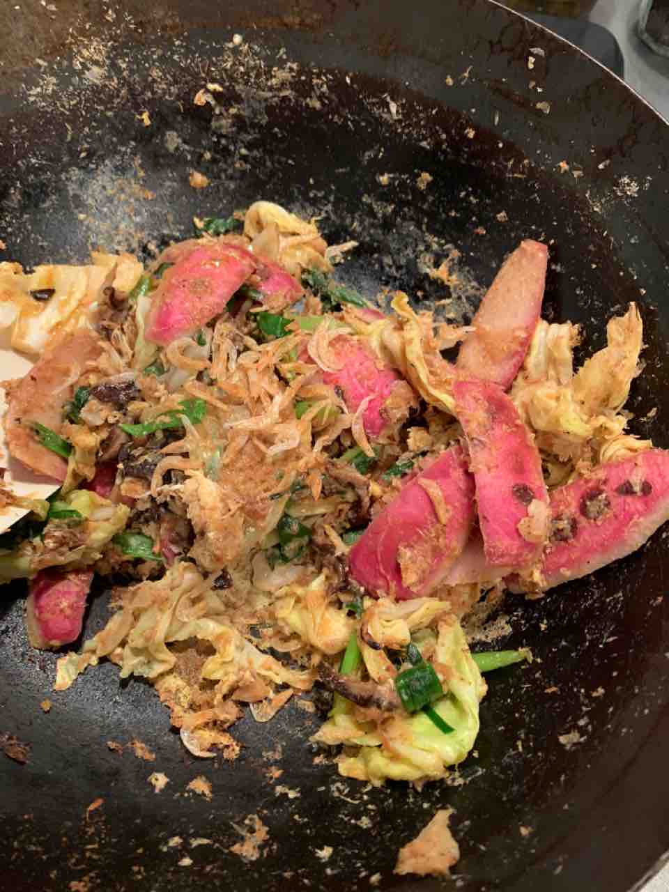 冷蔵庫整理を進めていて、キャベツ、青ネギ、かぶの皮、椎茸、小海老、マグロ削り、卵 で炒め物も作りました。野菜室がスッキリしました。