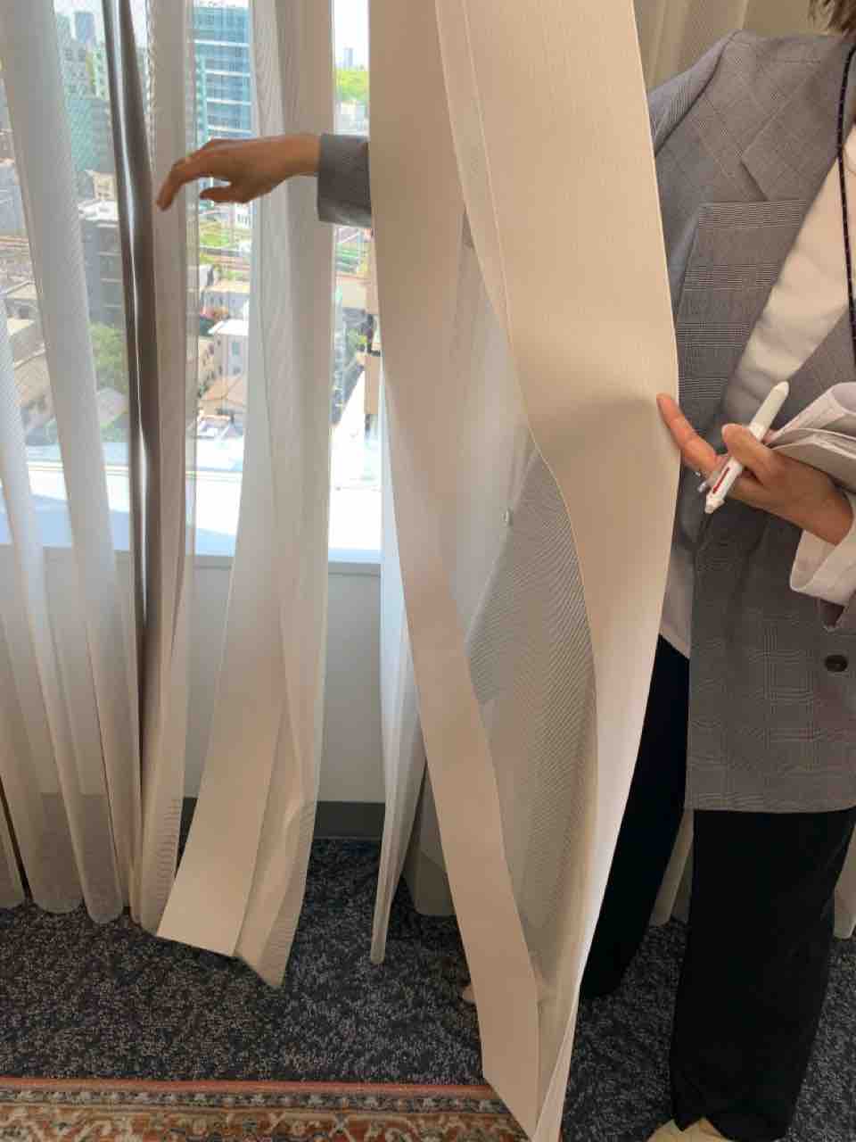 スマートドレープシェードとは、一見、レースのカーテンにしか見えませんが、ドレープの角度を変えて寝かせるようにすると、レースでない生地があらわれ、全く別のカーテンを引いたように見えます。