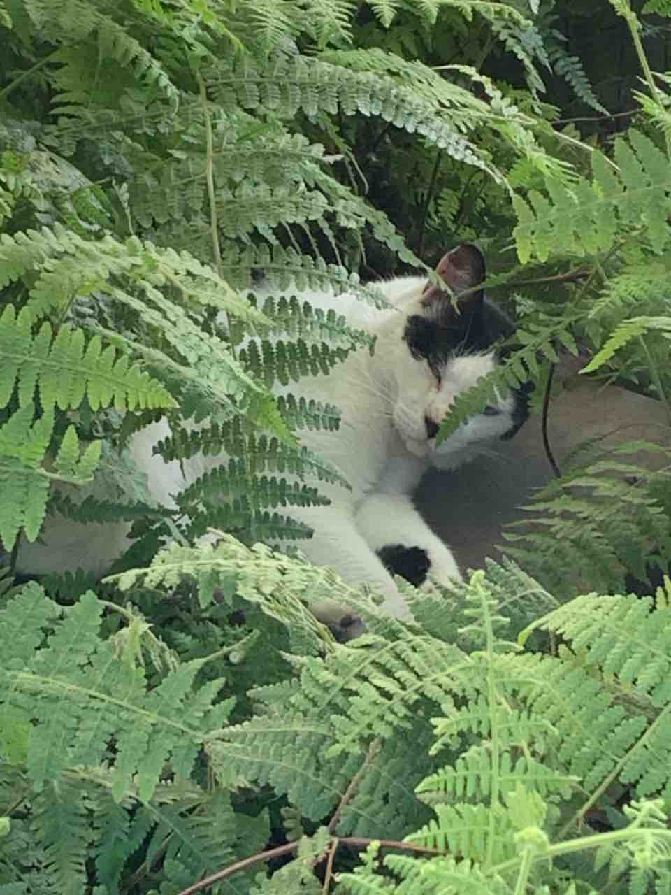 暑い日に植え込みの中で昼寝している猫。