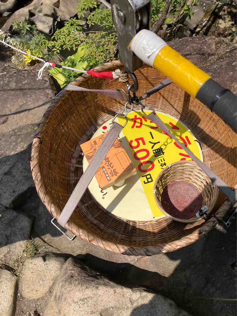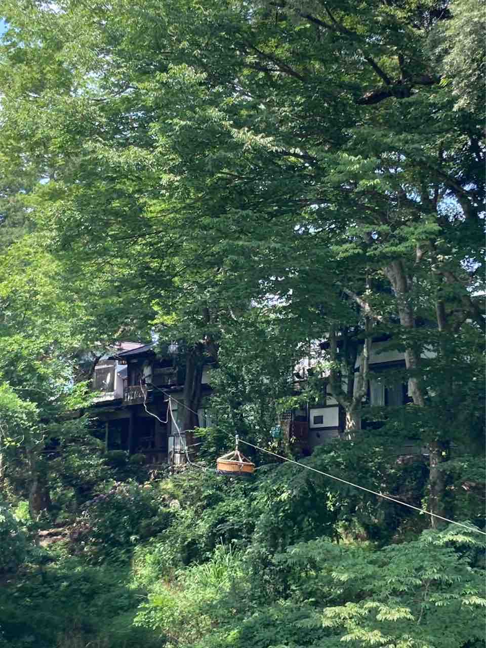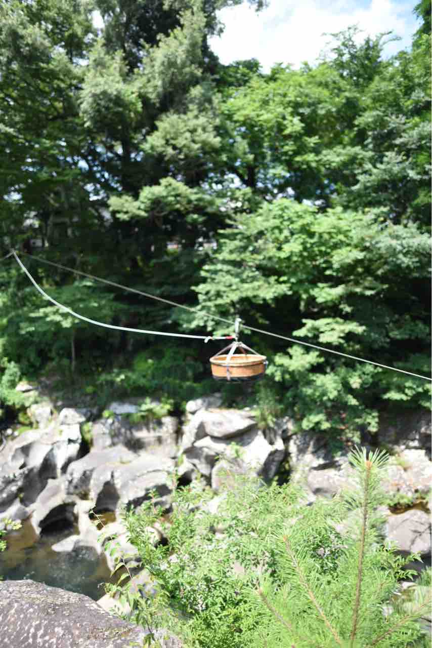 手前の東屋から対岸の店(郭公だんご)までワイヤーが張られており、それを伝って桶が行き来していました。桶にお金を入れて、傍らにぶら下がっている板を木槌で叩くと、桶が引っ張られ、しばらくすると桶が下りてきました。中にはお茶とだんごが入っていました。