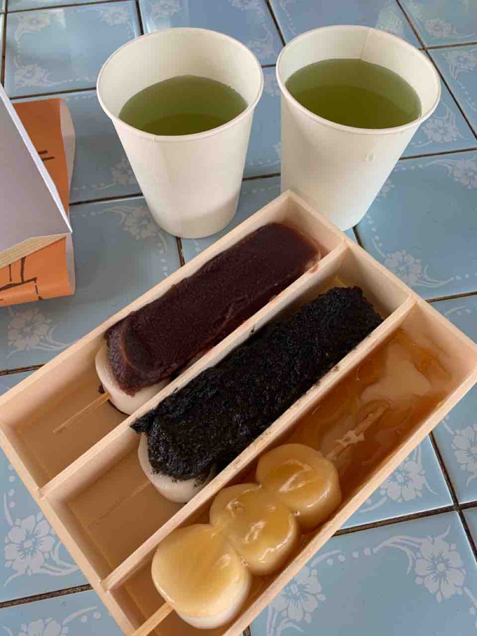 私たちもそれにならって注文しました。だんごは1箱しか注文しなかったのに、お茶は人数分入れてくれていました。だんごはもちもちしていてすごくおいしかったです。