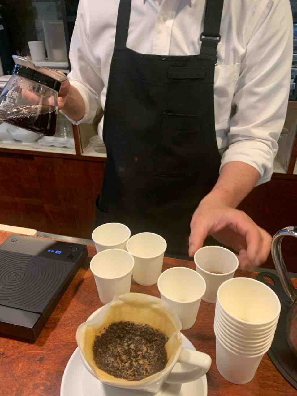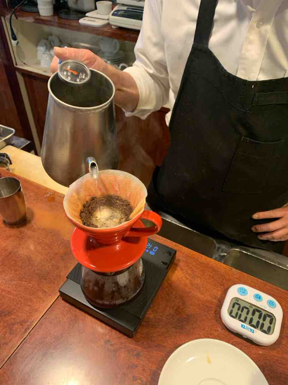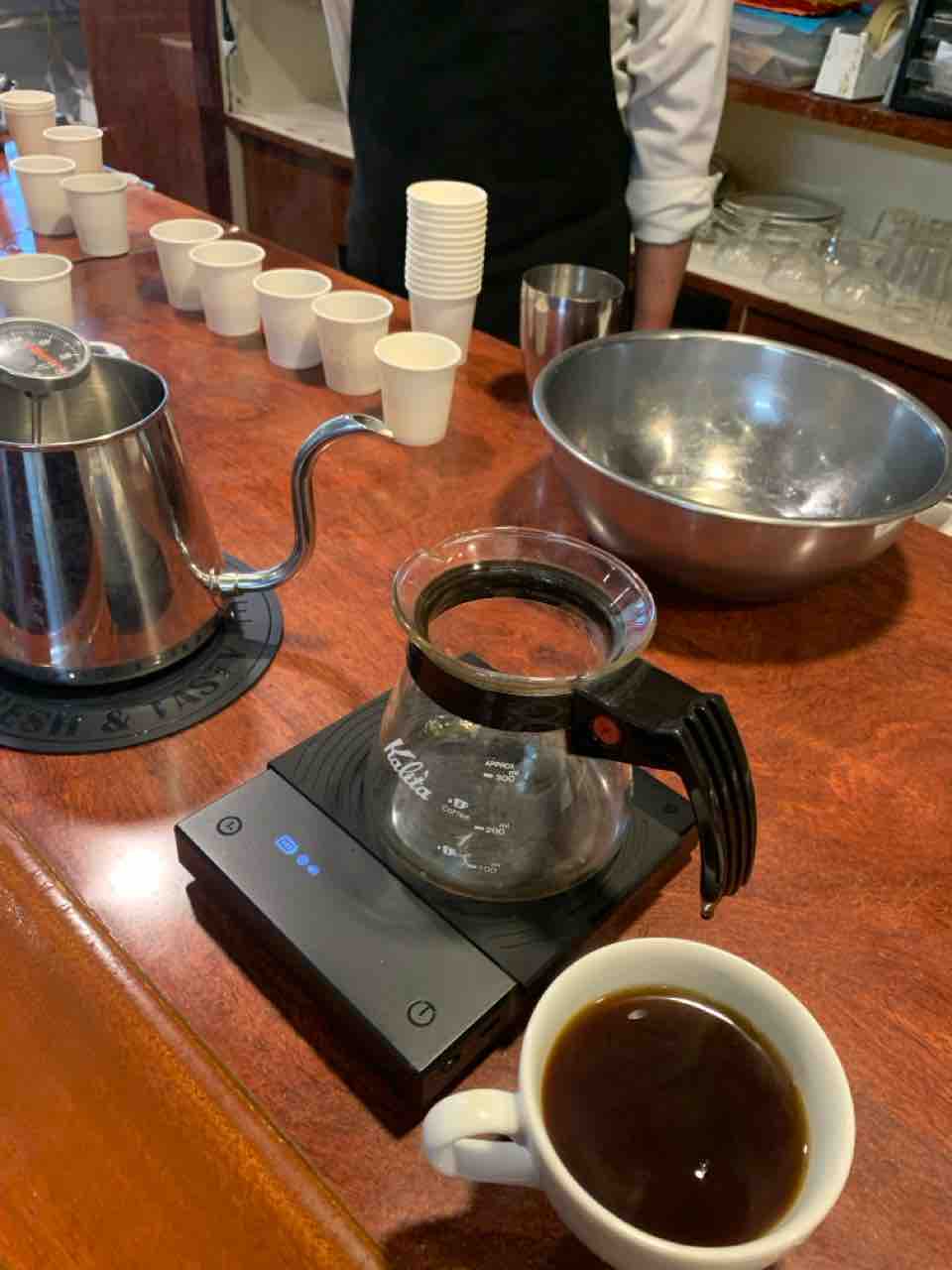 豆と水の分量、お湯の温度、蒸らし時間、何回に分けてお湯を入れるか、どのようにお湯を入れるか、どれくらいの時間をかけるのか、などなど、詳しく教わり。