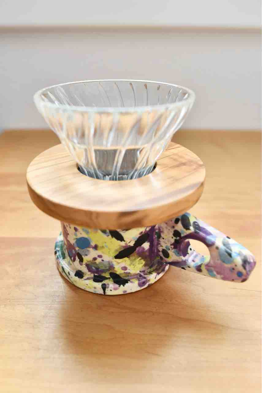 私が買ったのは、円錐型とスパイラルリブが特徴のハリオの V60 です。色んな大きさや素材がある中で、ガラス製の1~2杯用を選びました。オリーブの木とシリコンでできたホルダーも付いてきました。