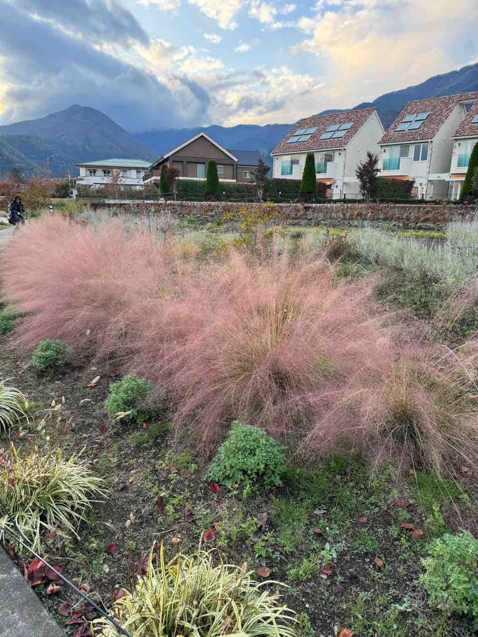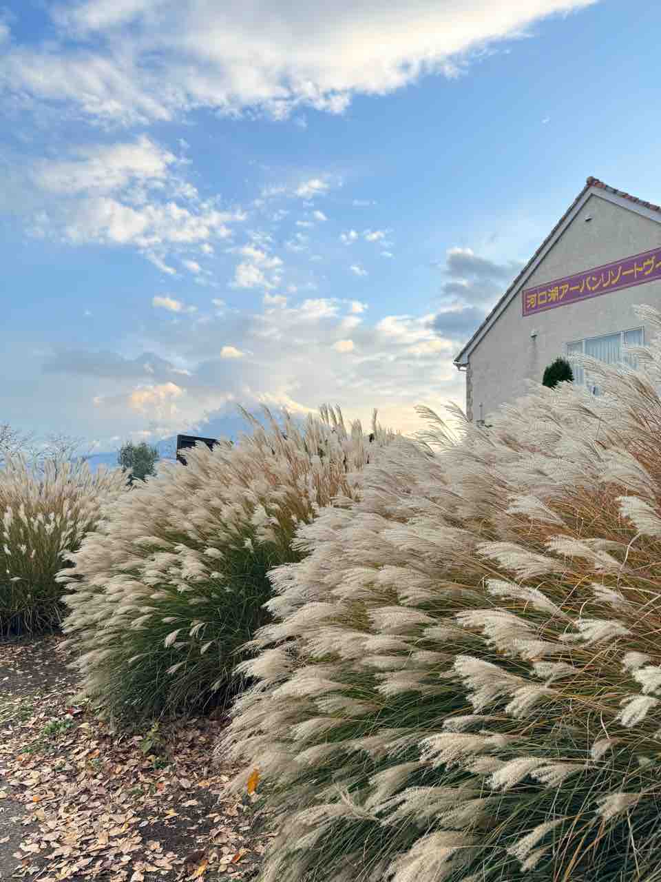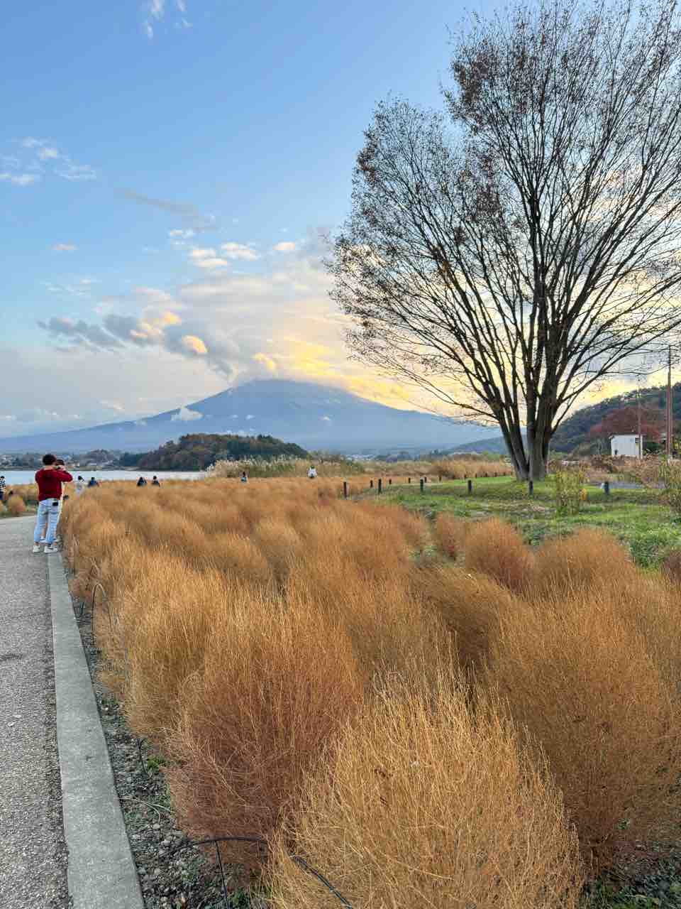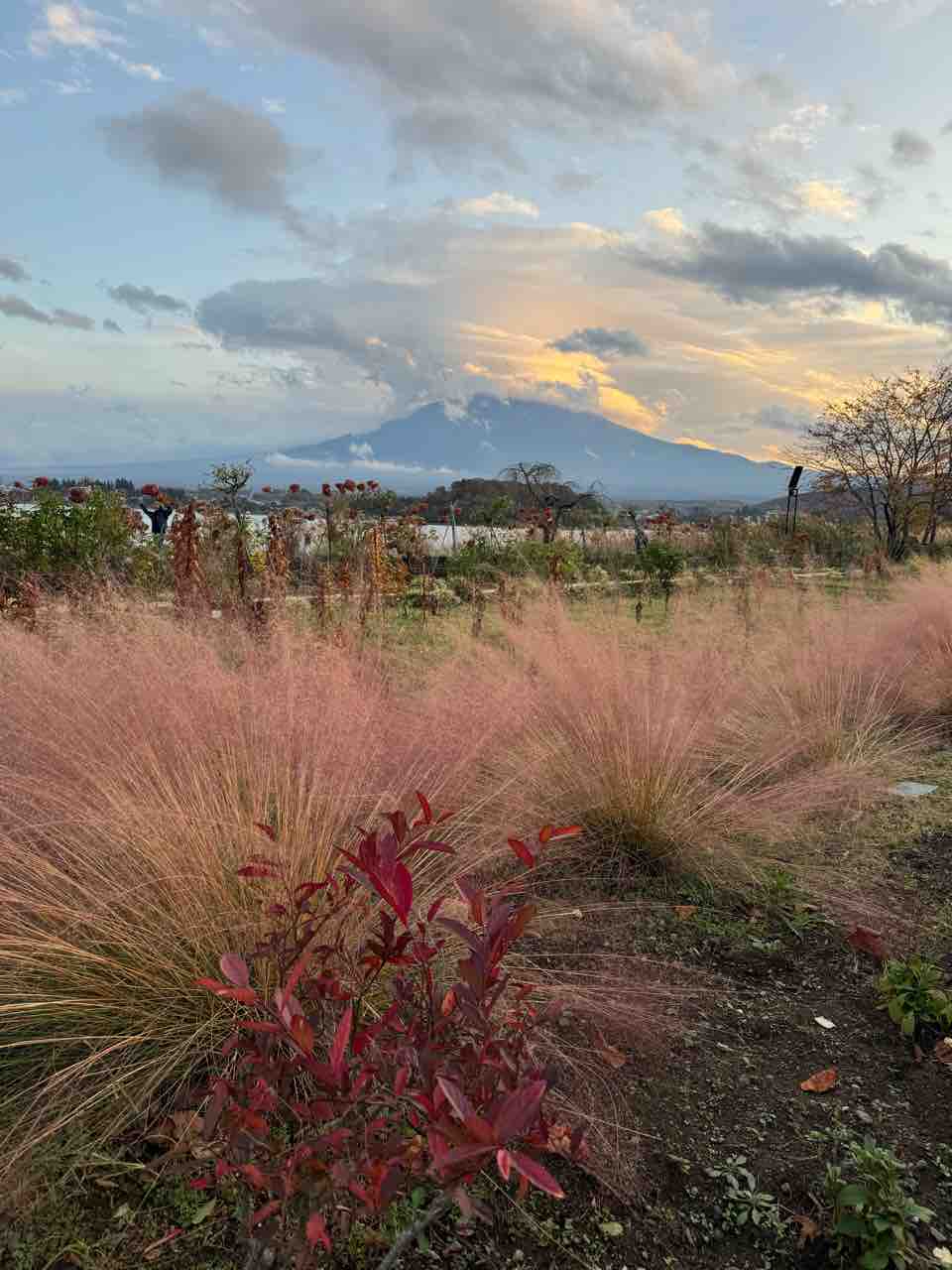 曇っているのが残念ですが、ミューレンベルギアの奥に河口湖、その奥には富士山が見え、感激しました。