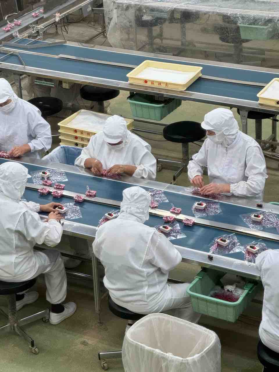 ついでに工場見学もしました。それでわかったのは、信玄餅の外装の風呂敷のようなビニル袋は人力で結んでいるということ。30人体制でやっていました。