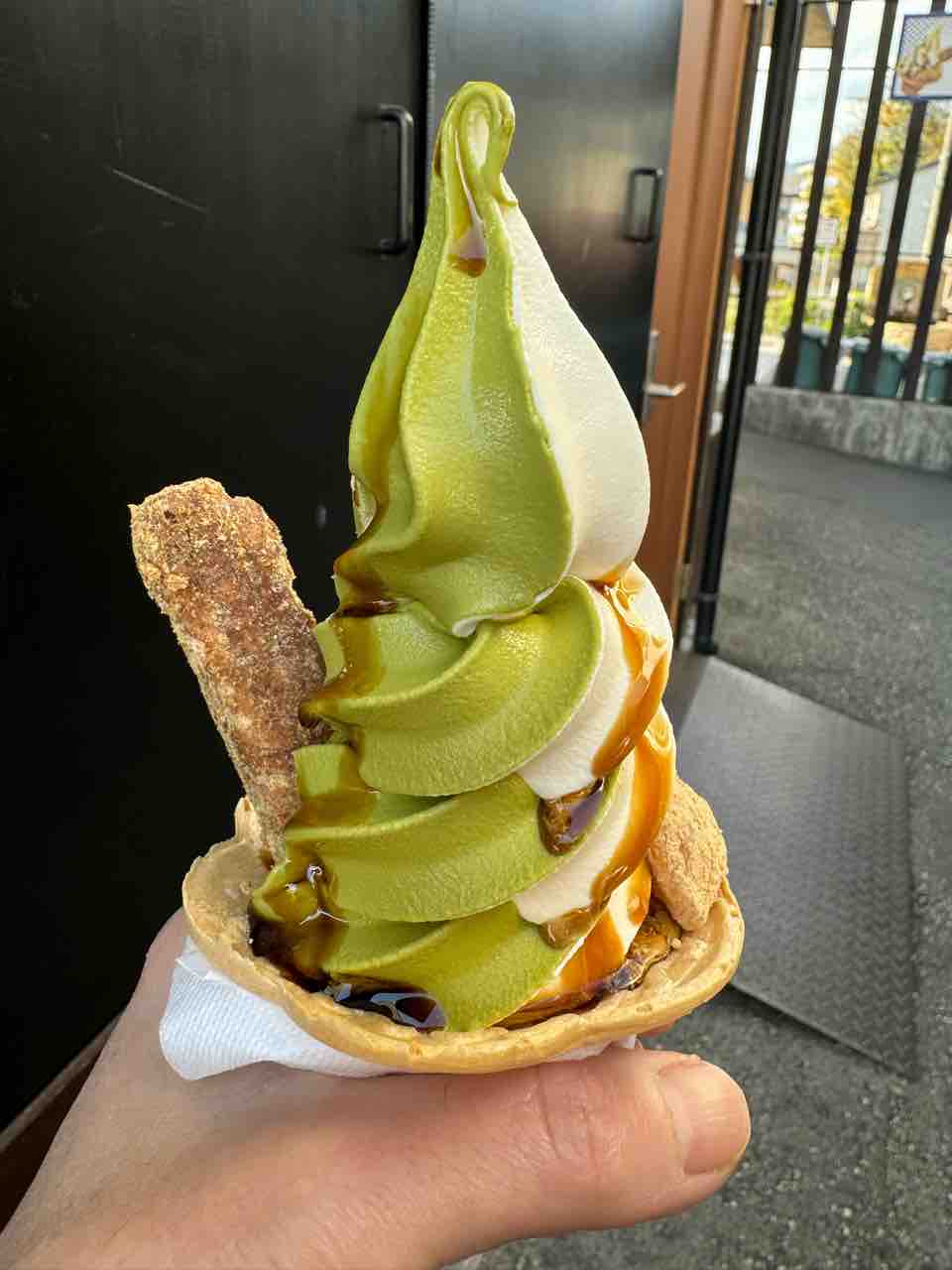 笛吹市まで行き、信玄餅で有名な桔梗屋の工場直売所に行きました。そこで信玄餅ソフトを食べました。