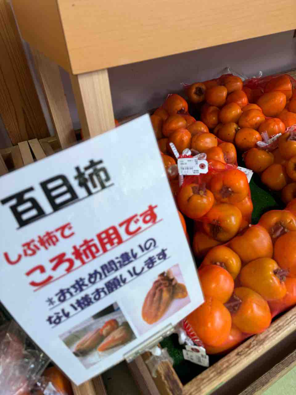 干し柿用に枝付きにした渋柿。これ買いました。他にも、シャインマスカットやキウイのレインボーレッドが格安で売られていたので買いました。