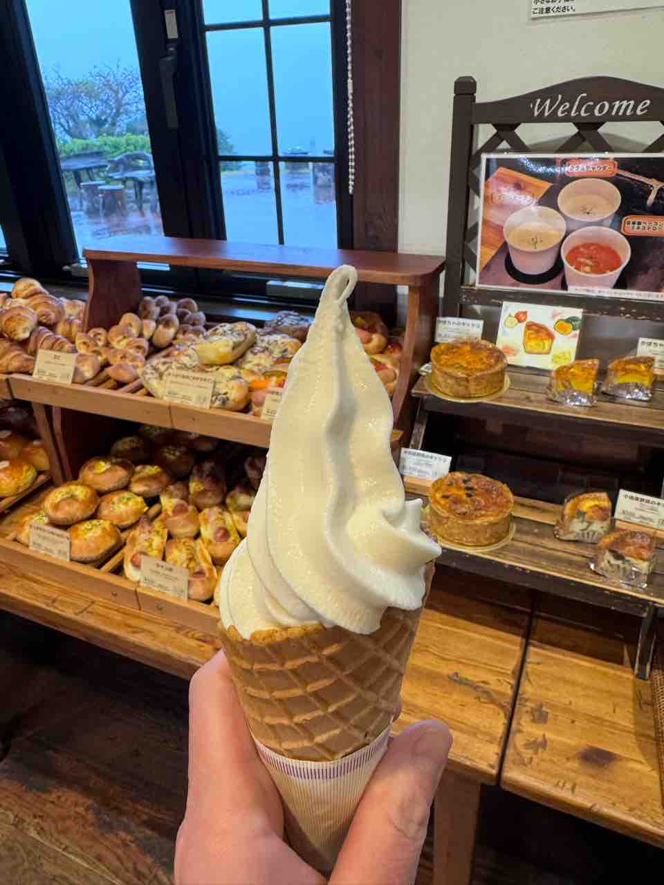 食後に、近くにある、石垣一夜城そばのヨロイヅカファームに行き、ソフトクリームを食べました。雨が降っていたのでテラスでのんびりすることはできず、車の中で食べましたが・・・。