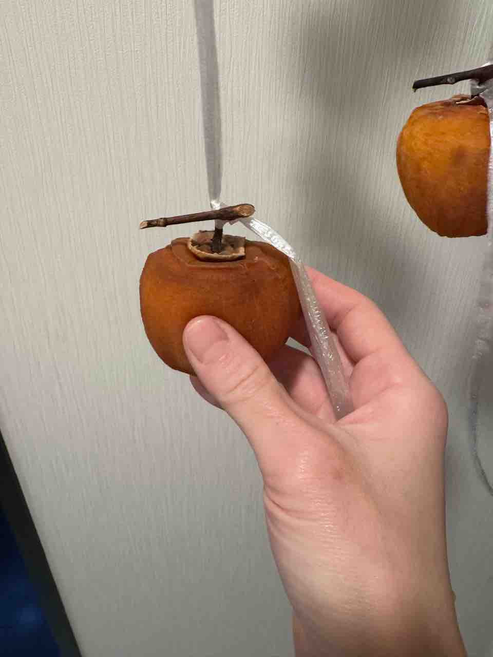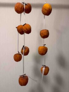 昨日辺りから、急激に乾燥が進んで実が縮み始めました。下の写真は、雨が降るということだったので一時的に屋内に取り込んだところです。普段は2階のベランダに干しています。