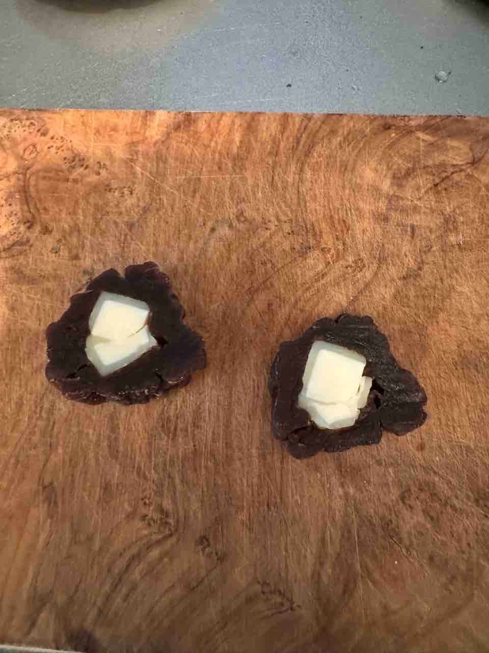 少々硬くなっていたので、表面に水をスプレーして柔らかくしました。中心にバターを射込むのですが、まず包丁で天地を切り落として、縦に一か所切り込みを入れ、平らにのしました。芯の部分に無塩バターを押し込み、柿を元通りに巻いて手で握ってなじませました。それをさらに輪切りにしました。