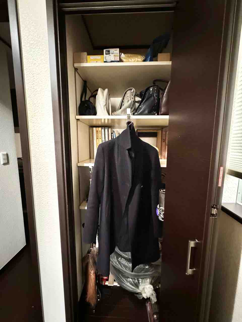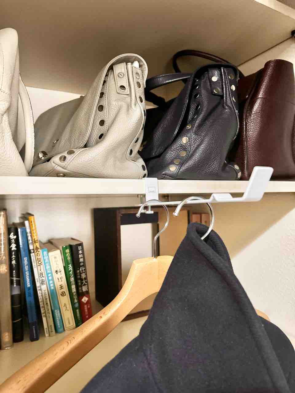 物入れの扉と棚との間に奥行き25cmほどのスペースがあったので、このハンガーを取付けることができました。