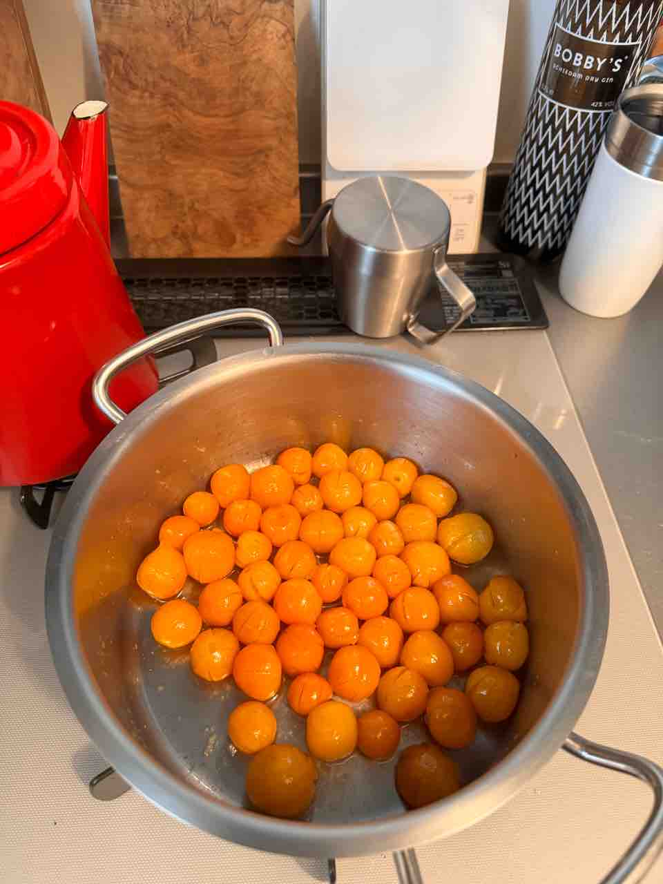 皮目に切り込みを入れ、ゆでこぼし、種抜きをしてから、シュガーカットゼロ顆粒で蜜煮にしていきます。