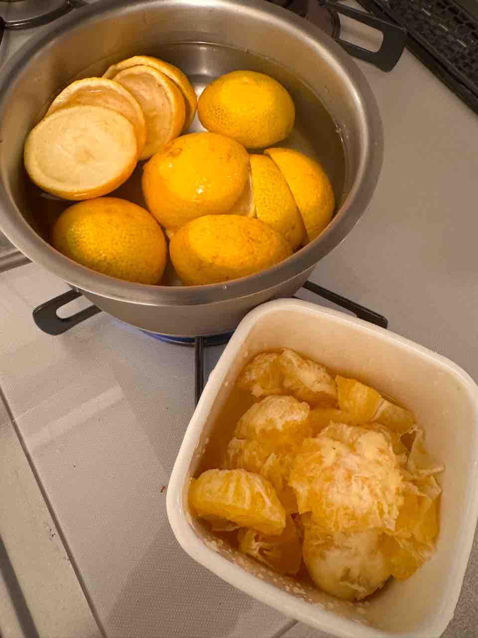 皮は3回ほどゆでこぼしてから、わたの部分をスプーンで掻き取り、砂糖を少しずつ加えて煮詰めていきました。その際、半球状の皮をくるくると丸め、編笠のようにして形を整えました。