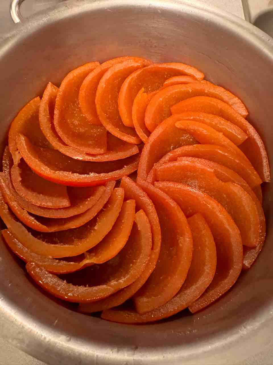 蜜(砂糖水)を加えて1時間ほど煮込んで冷ますことを3日間くらいかけて6回くらい繰り返し、煮きりました。