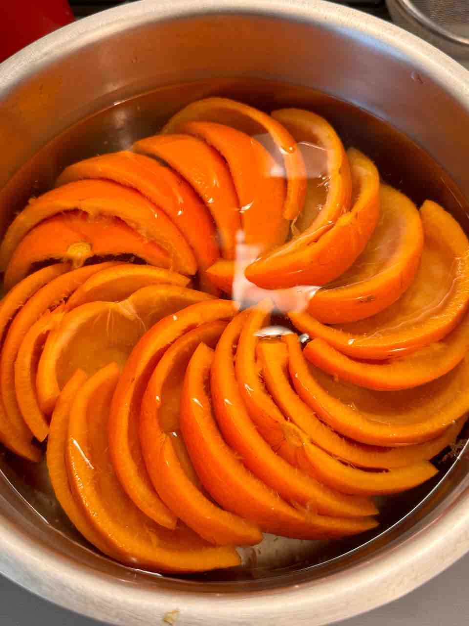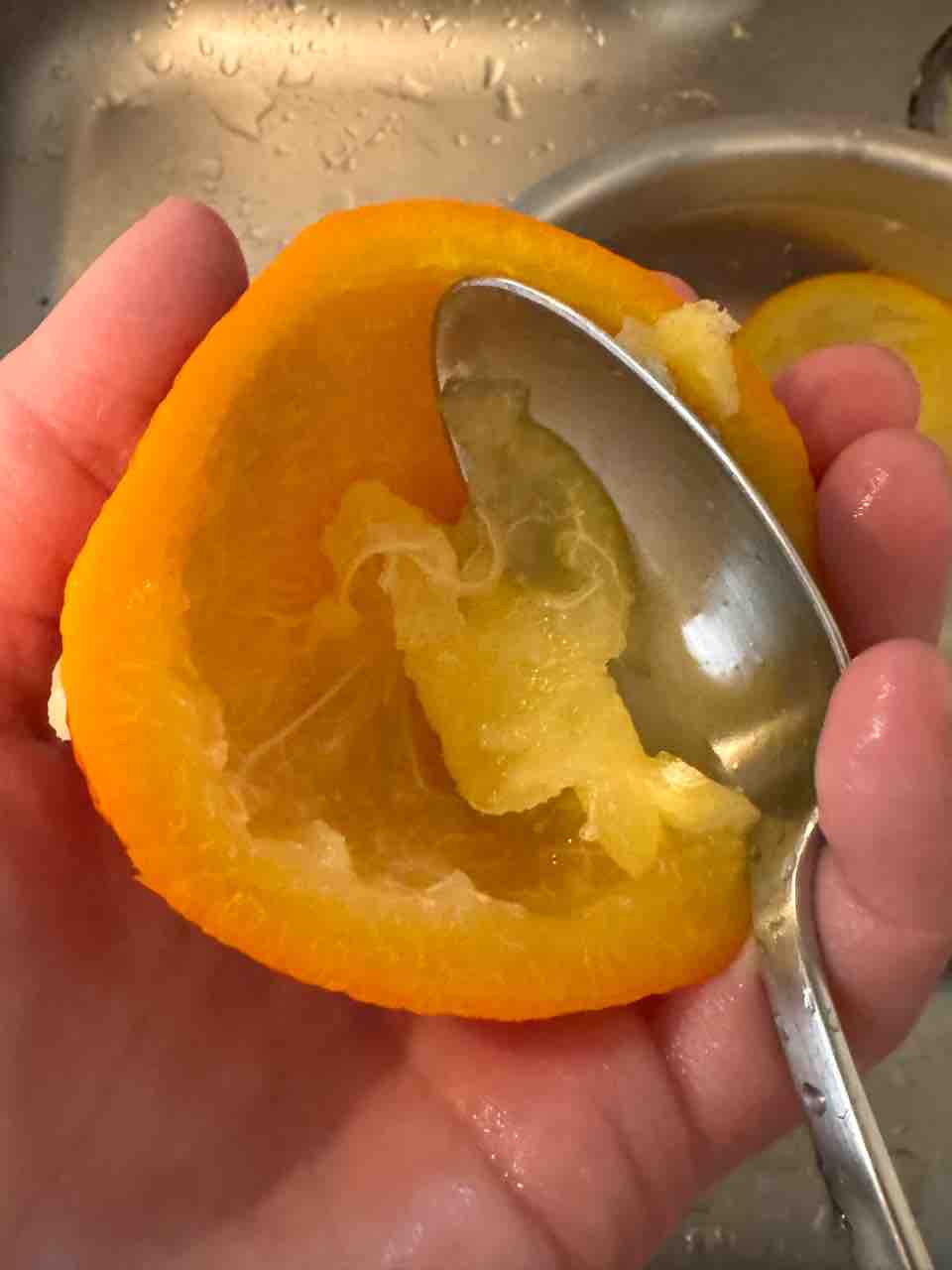 ダイダイの皮は、ピールにしました。3回ほどゆでこぼしてから、中のわたをスプーンで掻き取りました。