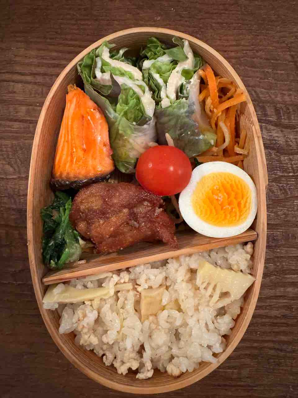 鶏ハムの生春巻き、鮭塩焼き、鶏の唐揚げ、半熟玉子、ナムル(ほうれん草、人参)、ミニトマト、筍御飯。