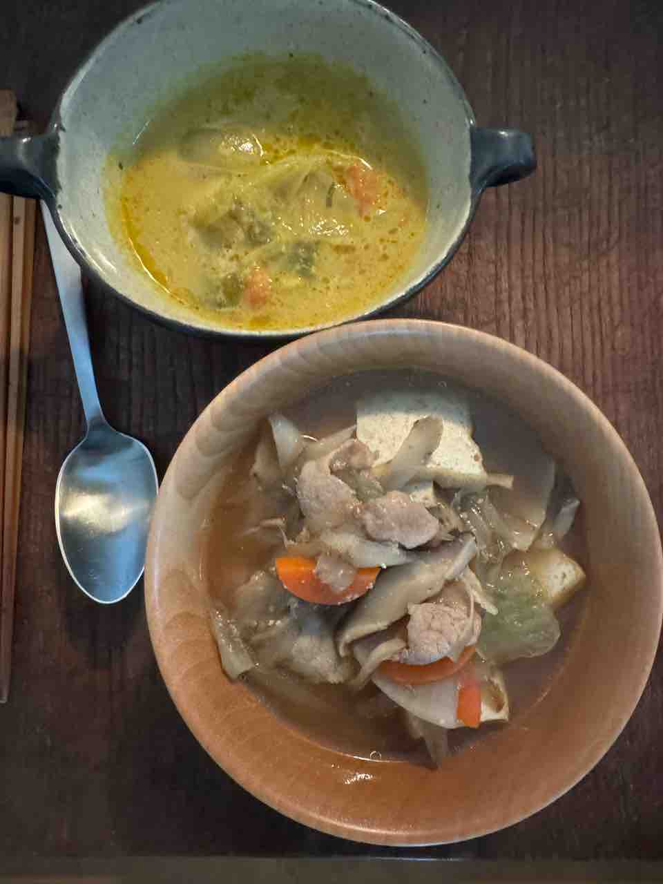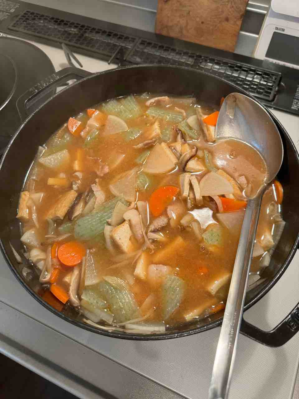 冷蔵庫の中の余ったものを使って、豚汁を作りました。