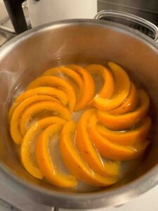 筍は、泥を洗い流して先端を切り、切り込みを入れて米ぬかと唐辛子を加え、電気IH圧力なべで水煮しました。汁ごと常温で冷ましました。