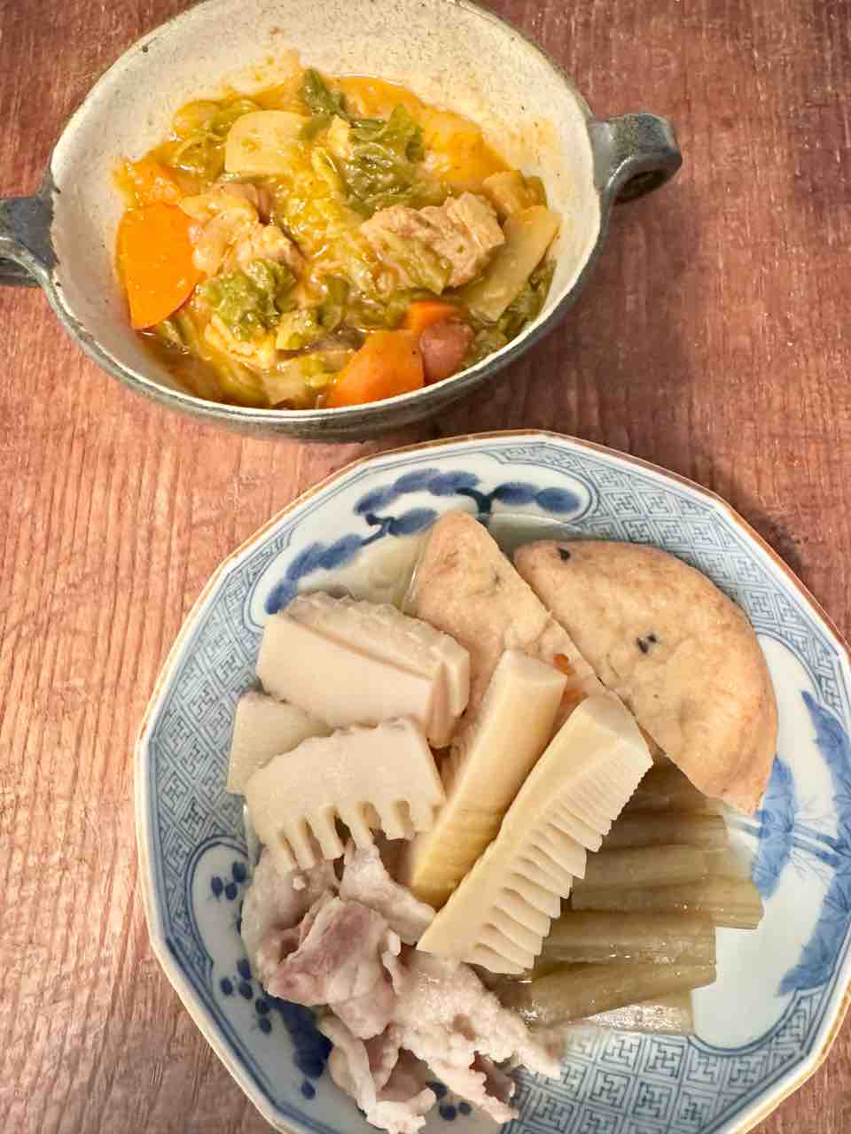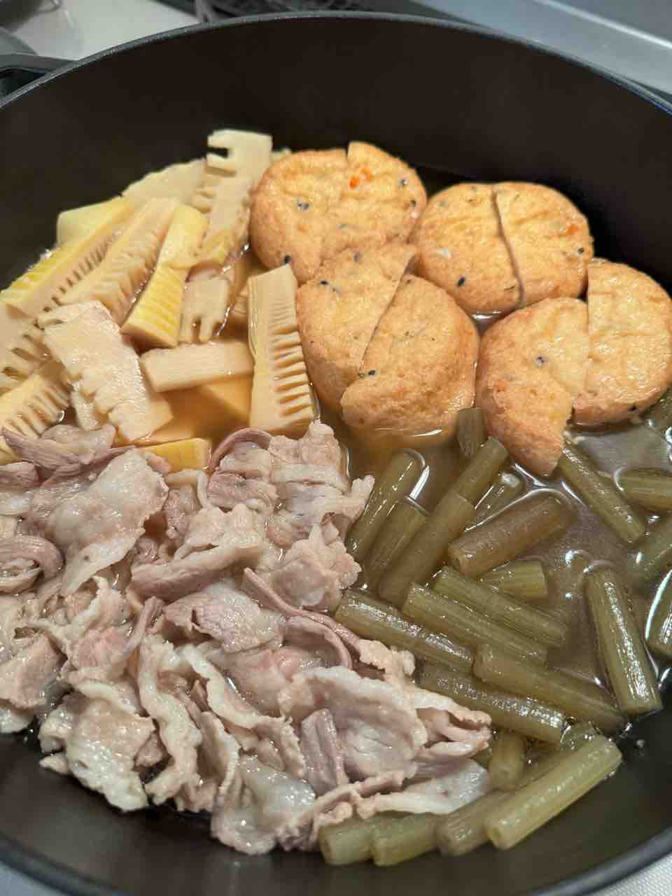 がんも、豚ばら肉、筍、蕗 をストウブのブレイザーソテーパン28cmに並べ、12杯の煮汁を入れてごった煮にしました。