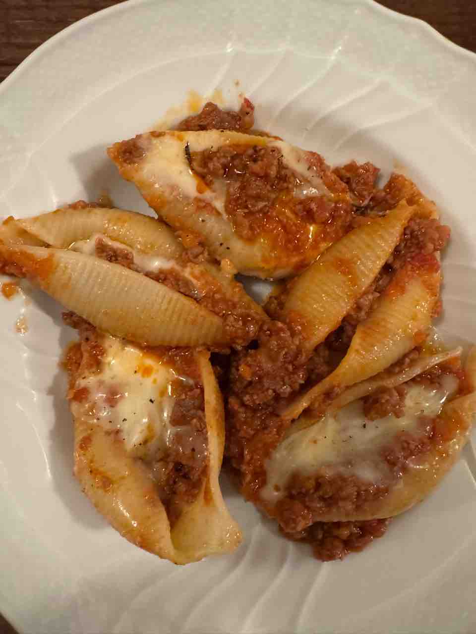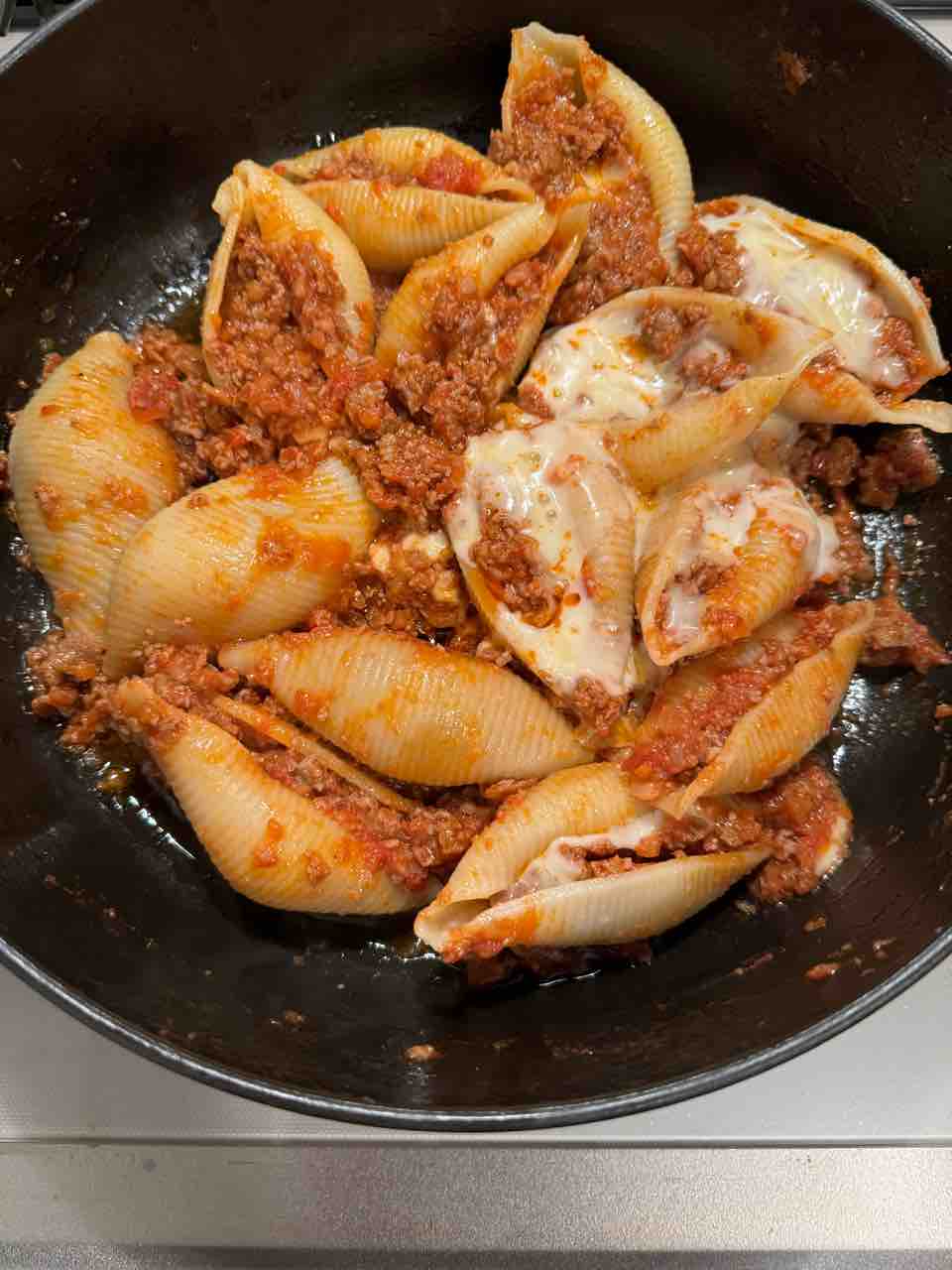 カルディで見つけた大きな貝殻パスタ「コンキリオーニ」を使ってパスタを作りました。ミートソースを作り、コンキリオーニに詰め(まるで餃子みたいなサイズ感)、少しだけあったシュレッドチーズをかけてみたりしました。食べ応えがありました。