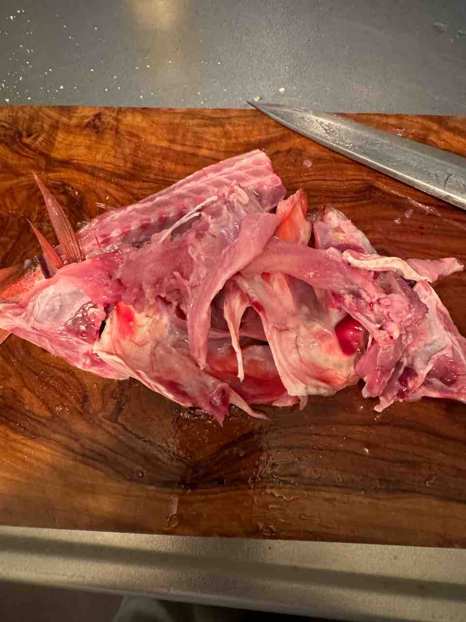 うろこを取り、水洗いしてから三枚卸しにして、アラは霜降りしてブラシでよく掃除してから昆布も加えて出汁を取りました。
