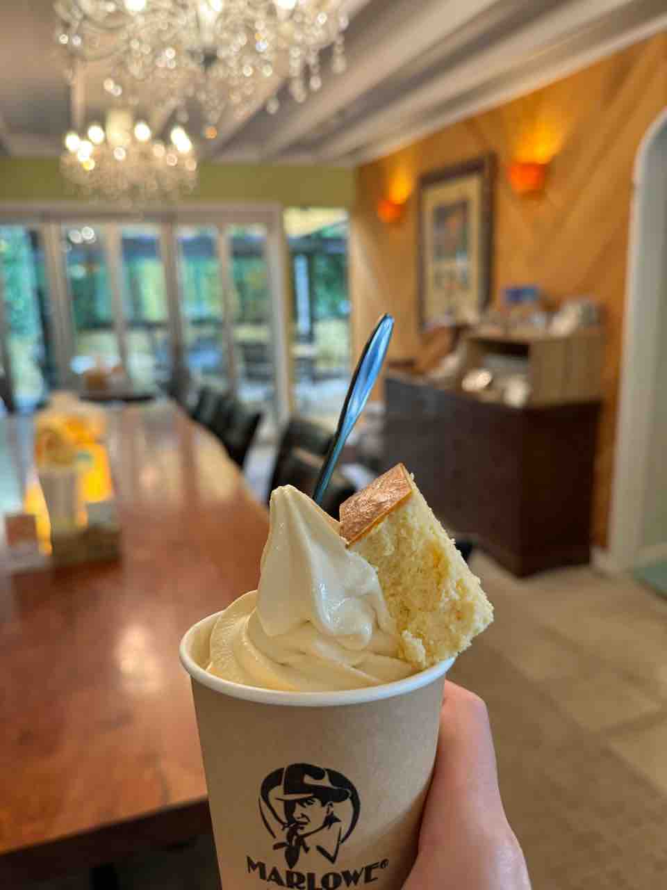 帰り道、逗葉新道を通って小田原に帰る途中で、マーロウ に立ち寄り、プリンソフトを食べました。ひとつ700円で少し高いように感じられましたが、大きなソフトクリームの上にずっしりとした大きなチーズケーキがのせられ、キャラメルソースは掛け放題となっていて、納得の味わいでした。