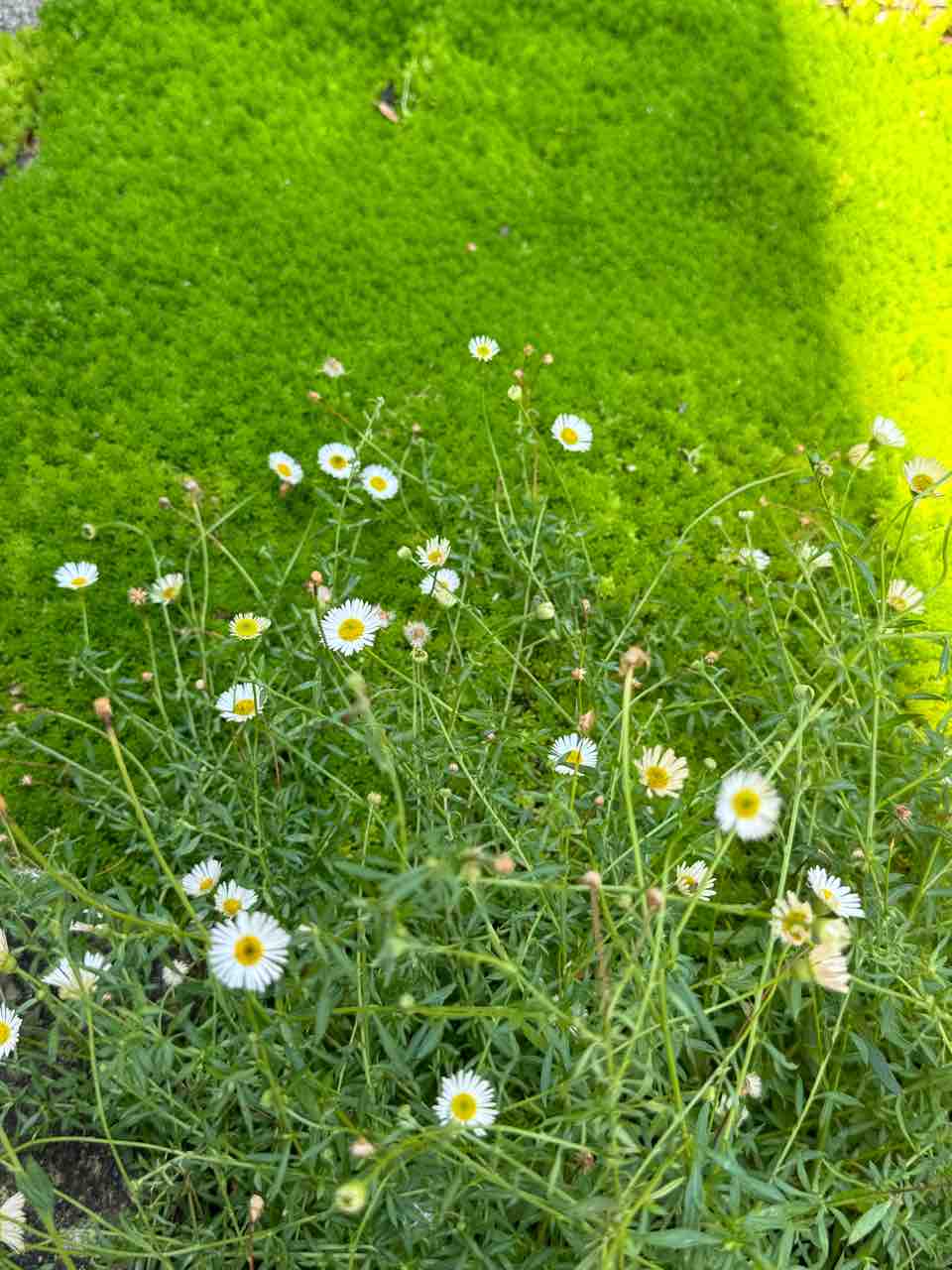 庭の植物、自生のセダム(マンネングサ)が広がり、エリゲロン(源平菊)も良い感じにこなれていました。