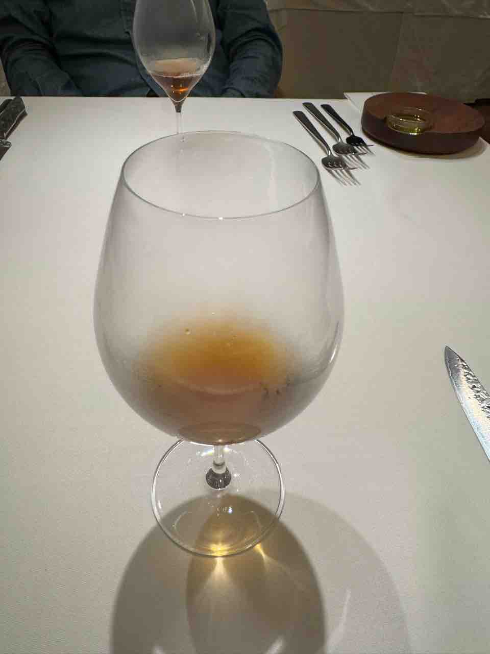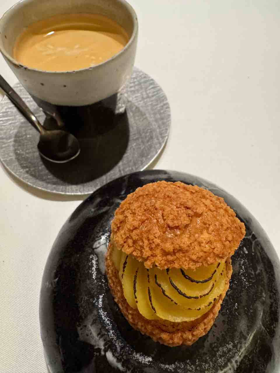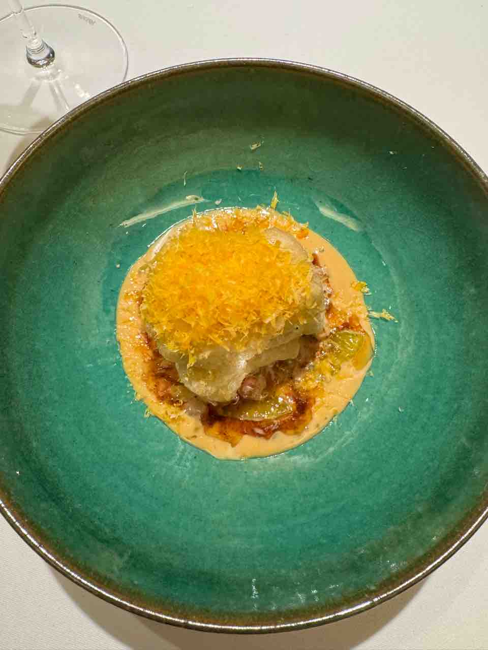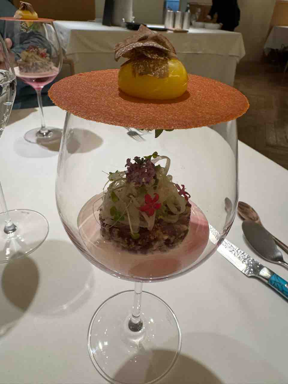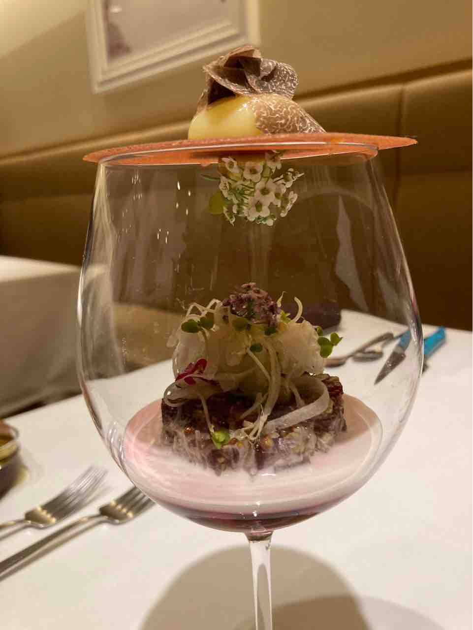 そしてスペシャリテの一品「エール」。まるでパフェのような立体的かつ繊細な盛付けでした。ビーツのムース、ビーフコンソメ、青大根、カリフラワー、馬肉のタルタル、セロリとブロッコリーのスプラウト。グラスの上には玉ねぎのチュイル、卵黄、黒トリュフ が乗っており、チュイルを割って中に落として混ぜていただきました。すごくおいしかったです。