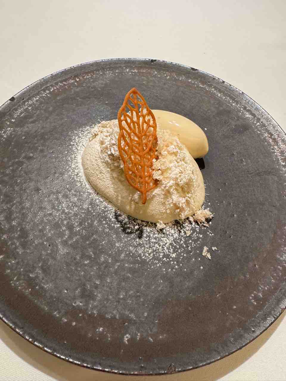 ほうじ茶のアイス、和栗のエスプーマ、ガトーショコラ、ルバーブのジャム。