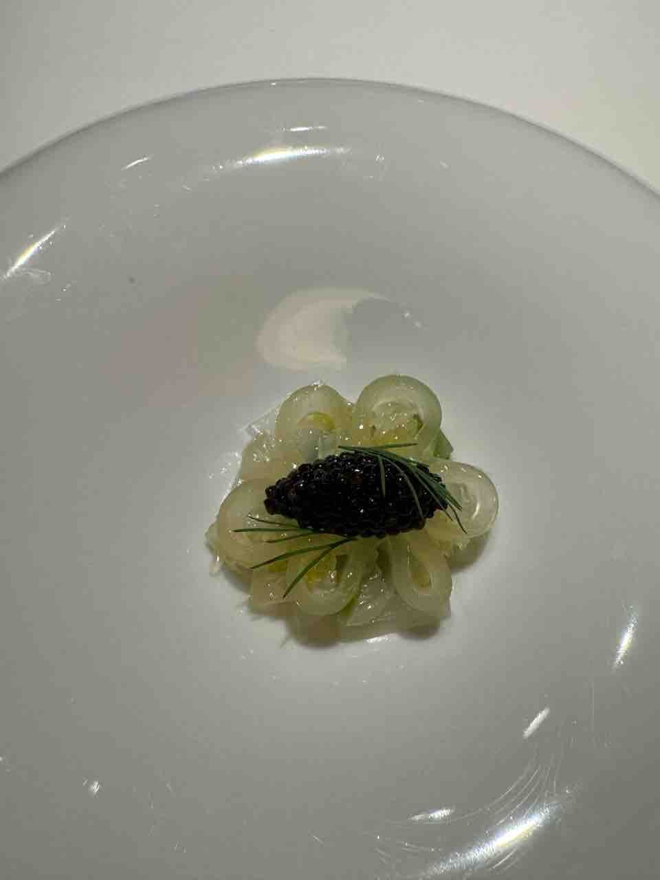 オードブルはソデイカ、グレープフルーツのジュレ、水晶文旦、キャビア、ディル、色々なハーブのマヨネーズを敷いたもの。
