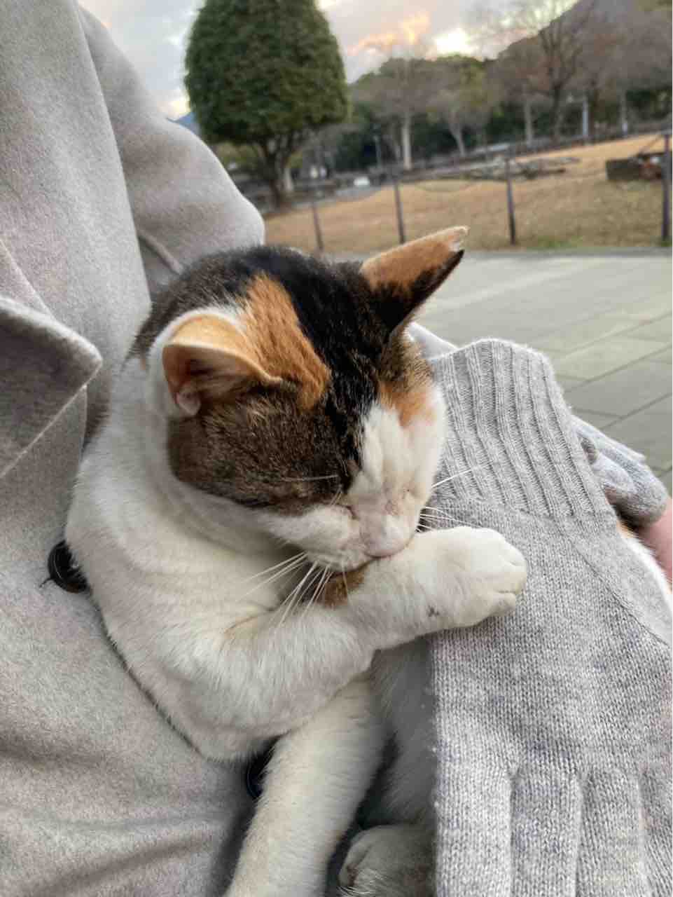 他の場所でも、かわいい地域猫がいて、膝の上に乗ってきました。