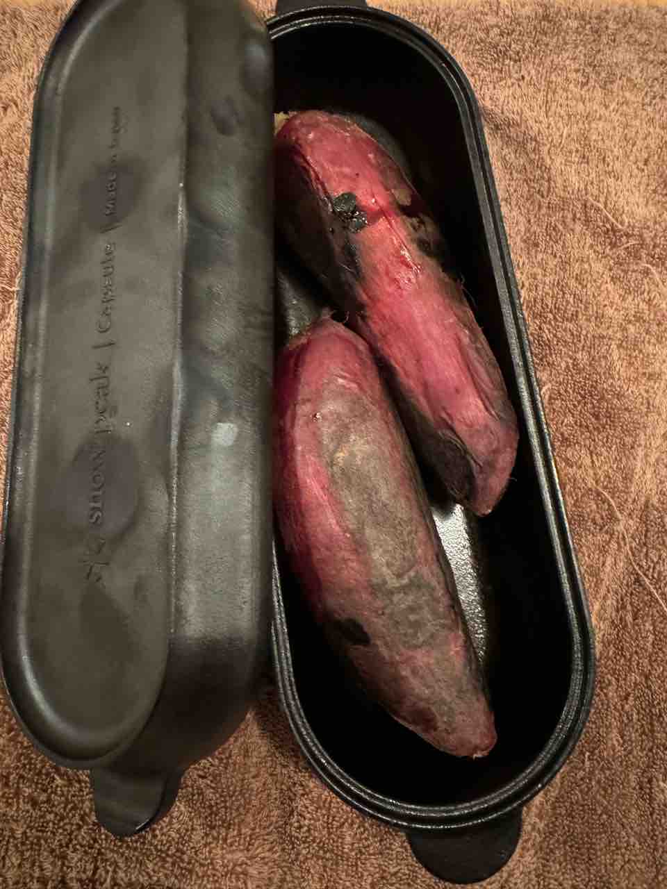 紅はるか をsnow peak のダッチオーブンに入れ、1時間ほど(時折ひっくり返しながら)じっくりストーブの上で加熱すると、信じられないくらいおいしい焼き芋が作れます。どんなスイーツよりも好きです。冬の間、お菓子をほとんど買わなかったくらい。
