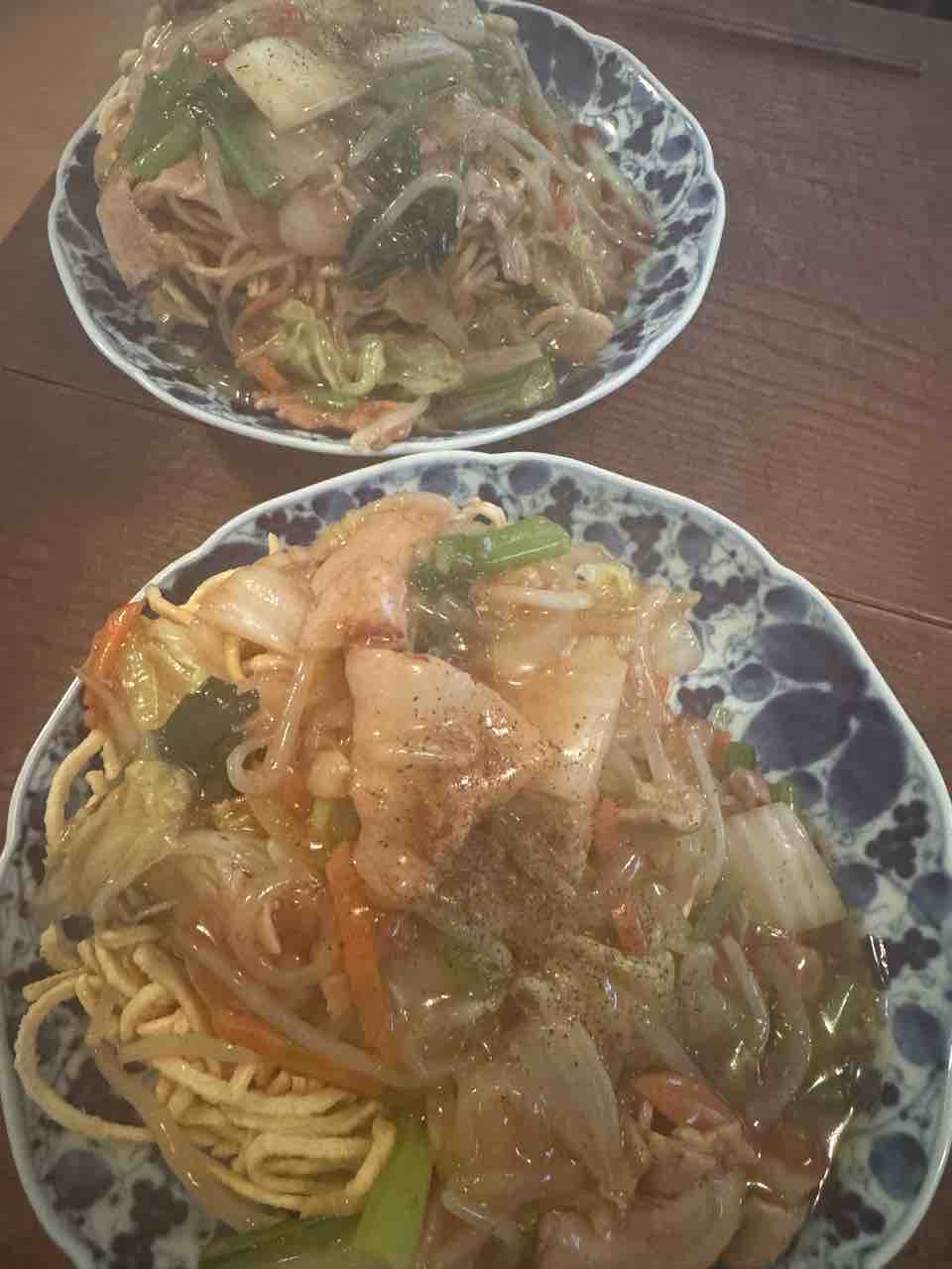 白菜、小松菜、人参、もやし、豚ばら肉 で皿うどんを作りました。