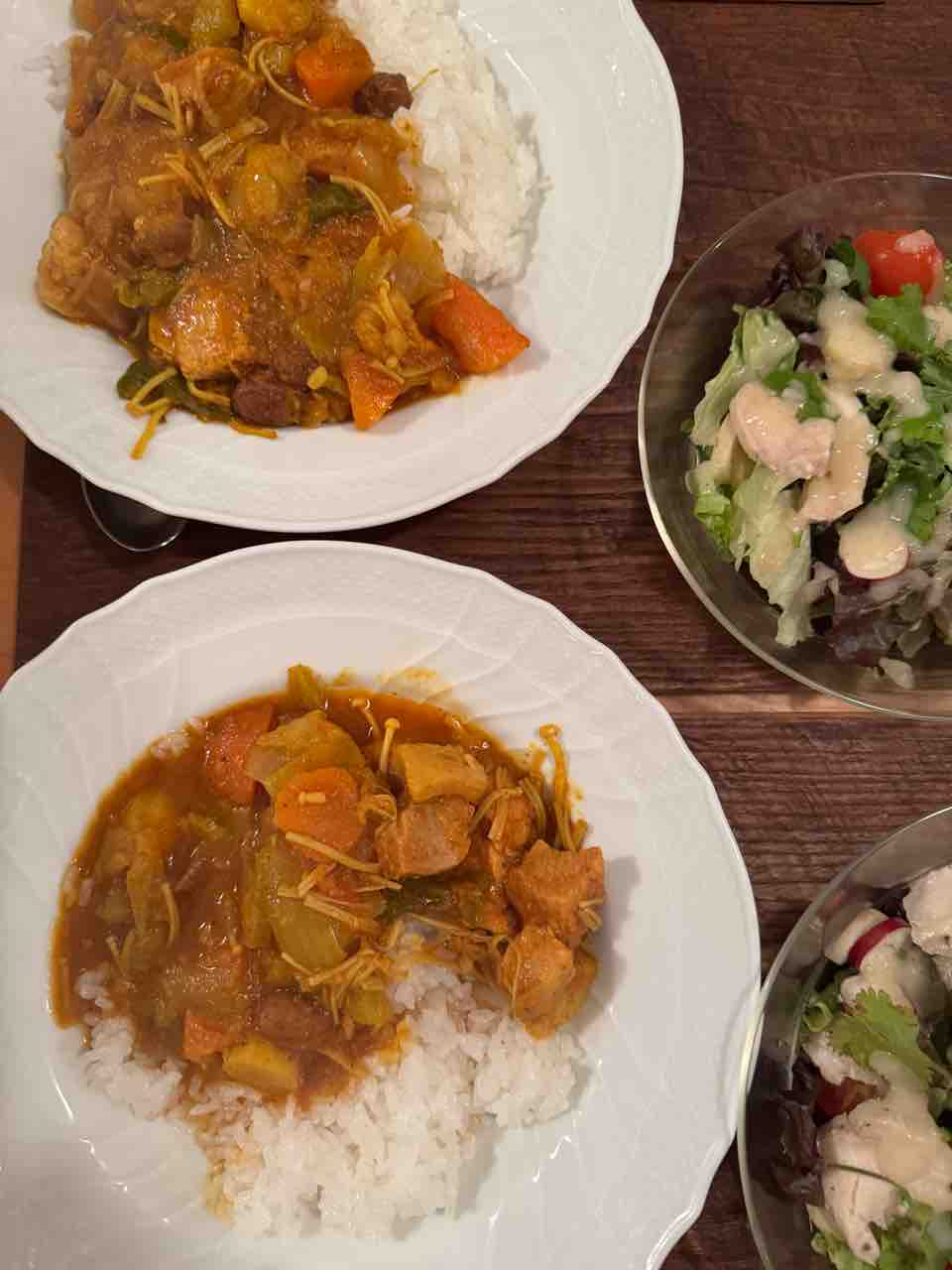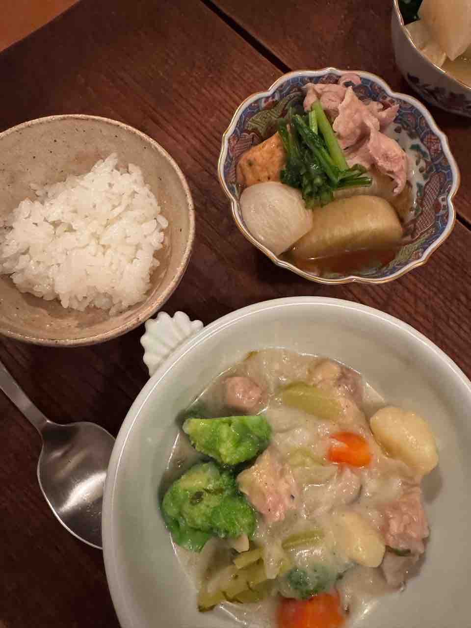 豚ばら肉、大根、かぶ、がんも の煮物とチキンフリカッセ。