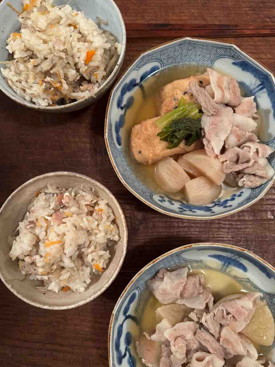 味がしみた煮物と、鶏肉、こんにゃく、ごぼう、人参、椎茸 が入った五目炊き込みご飯。