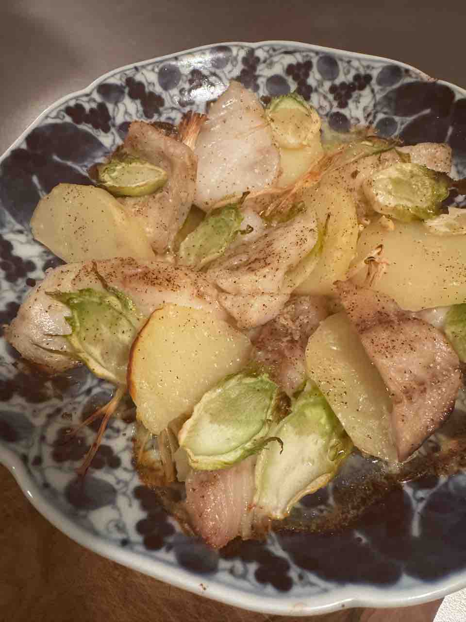 ヤオマサで新鮮なタラの切り身が売られていたので、骨と皮をのぞいてそぎ切りにしてオリーブオイル、塩、にんにく、レモン でマリネし、子持ち高菜とじゃがいもでオーブン焼きにしました。これ絶品でした。