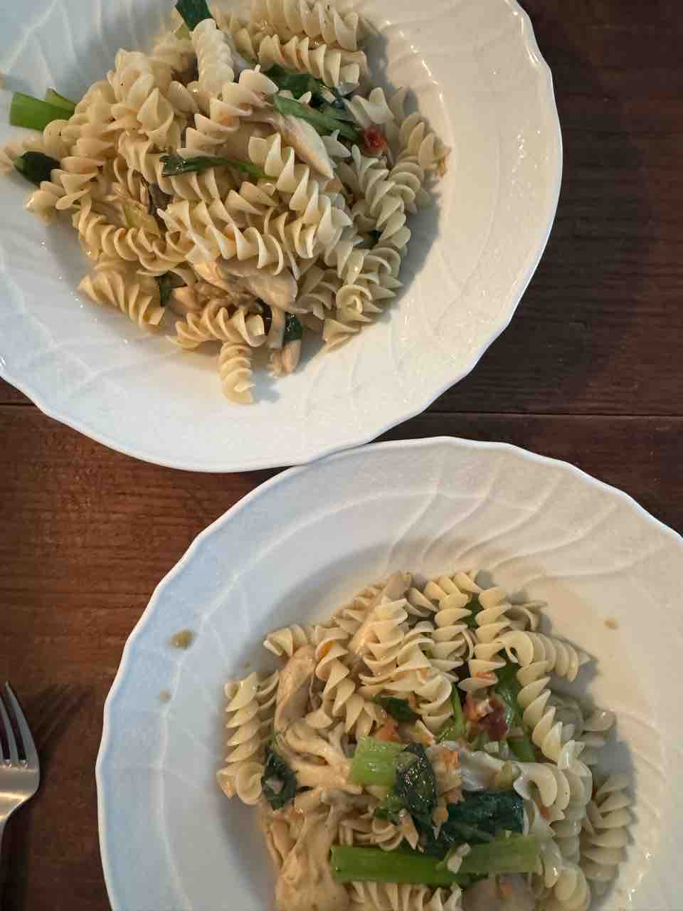 小松菜、ベーコン、玉ねぎ でパスタも作りました。はごろもの糖質50%オフのフジッリを使いました。