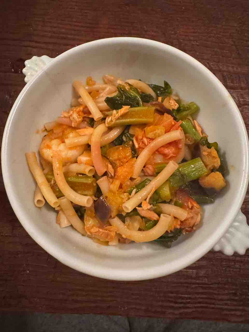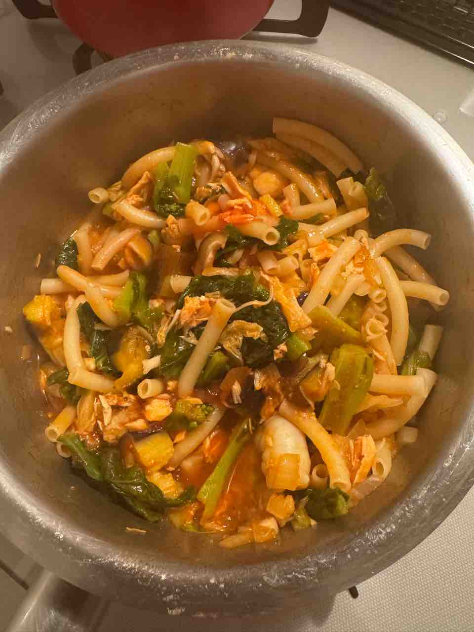 ひとりの時は、ひとつの鍋に水、オリーブオイル、塩、アンチョビ、海老、玉ねぎ、あまり野菜、トマトピューレ、低糖質パスタ を入れてぐつぐつ煮込んで食べたりもしました。