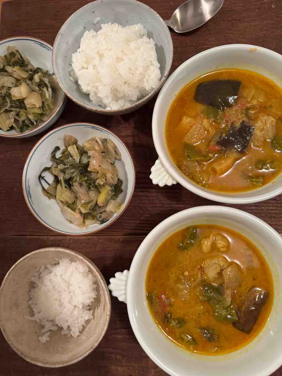 茄子、ピーマン、水煮筍、鶏もも肉 でグリーンカレーを作りました。
