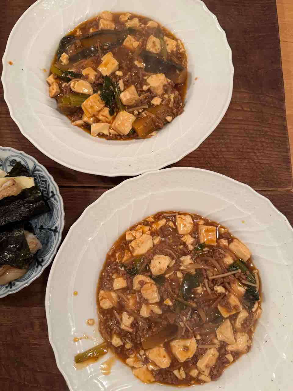 茄子、小松菜、えのきだけ が入った麻婆豆腐を作りました。出汁は乾燥帆立貝柱を戻して使いました。