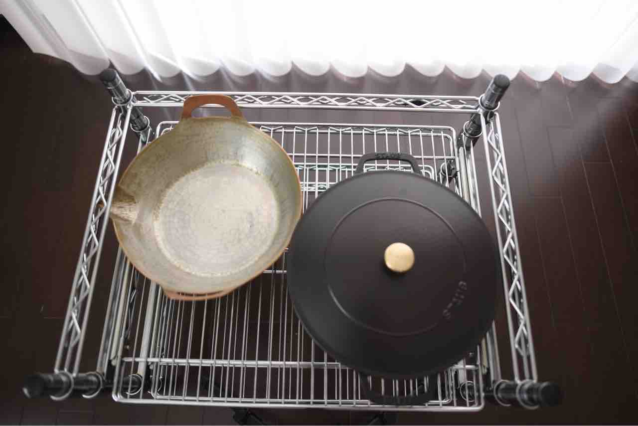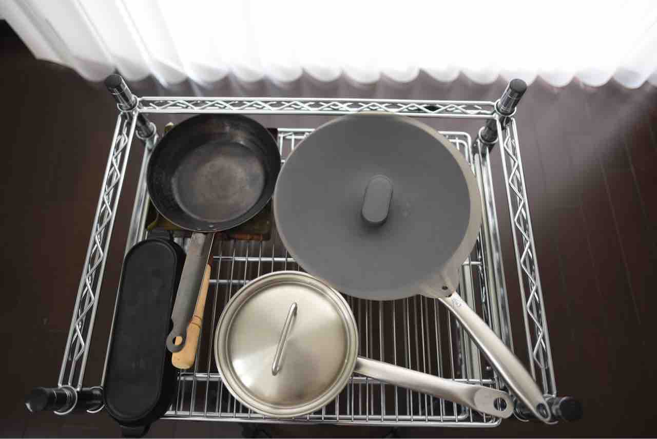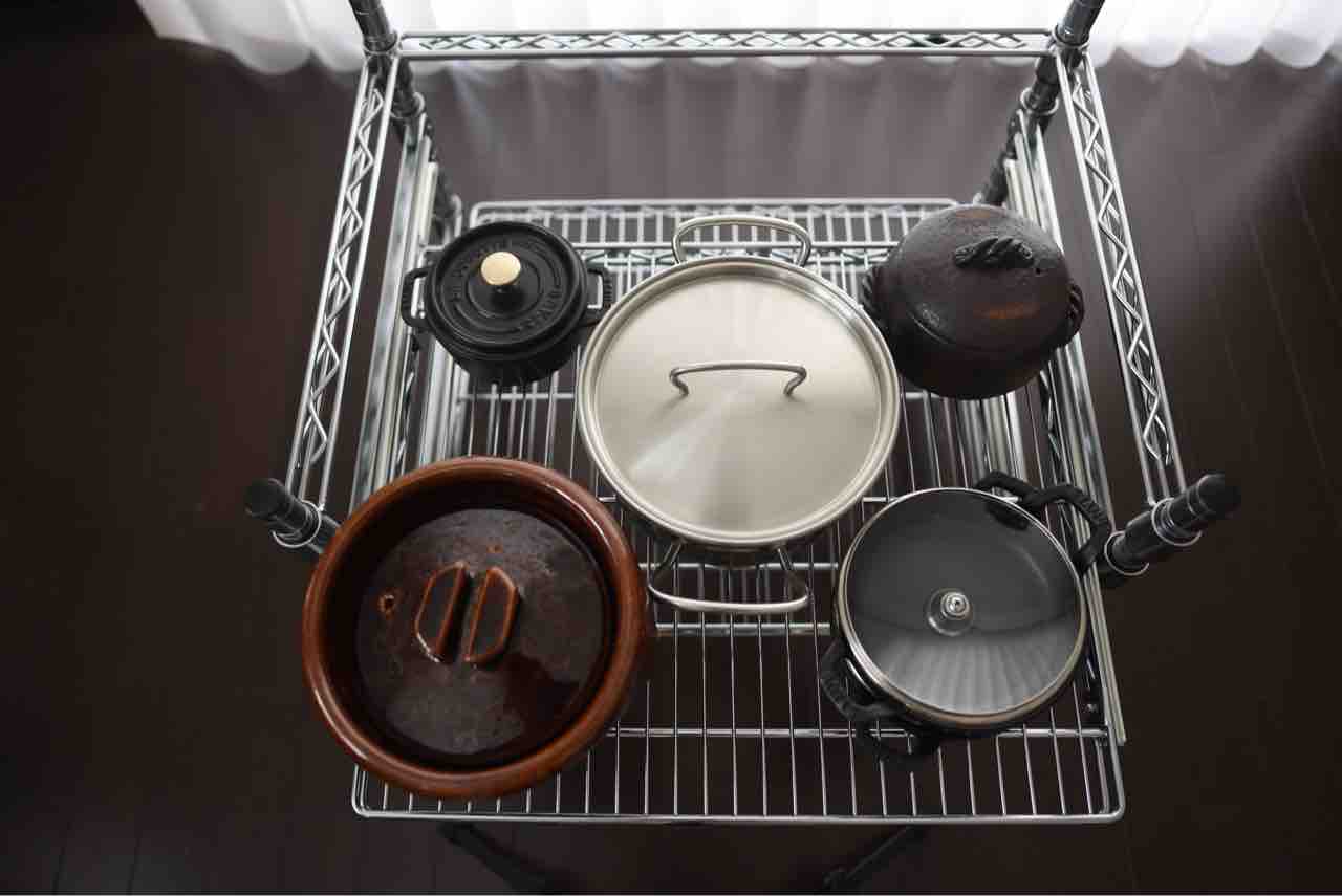 一番上の段には、小さい鍋や両手鍋を中心に置いています。
