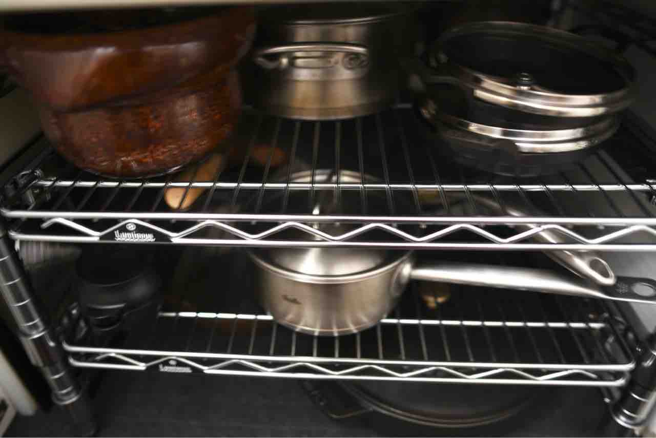 そんなに大きくはない収納ですが、奥行きがあるのと手前に少し引き出せるのとで、13個も収納できています。また、わが家の鍋は 鉄、鋳鉄、鋳物、銅、厚底ステンレス、土鍋 など、ほとんど全て重量級になるのですが、このスチールラックはびくともせずがっしりと受け止めています。これらの鍋は全てすぐに取り出すことができるから気に入っています。