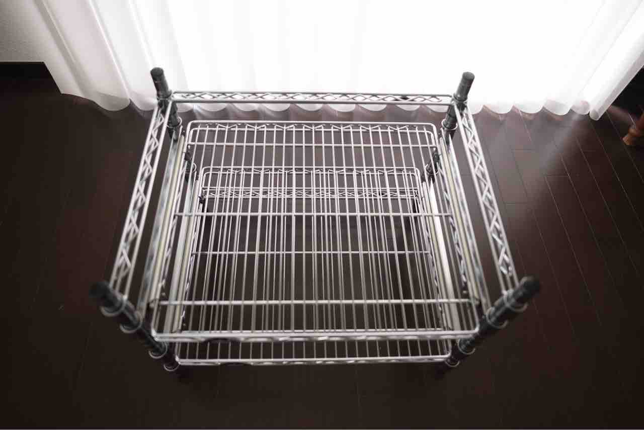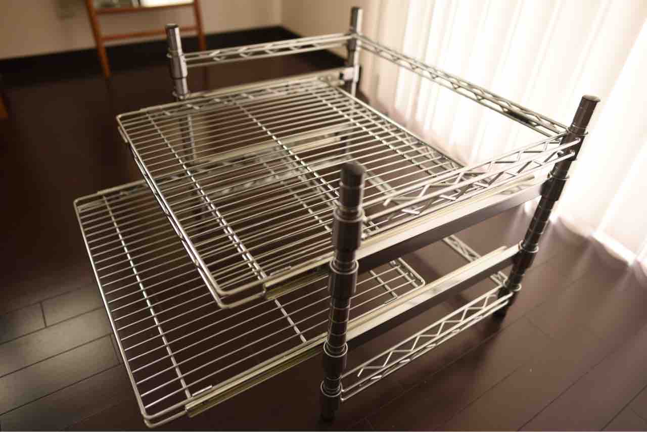 スチールラックがどんな風かより詳しく説明するために、ガスコンロ下から取り出してみました。2段になっていますが底面にも鍋を置くため実質3段分の収納になっています。棚はスライド式で手前にある程度引き出せます。