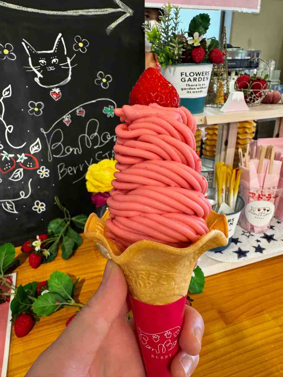 帰りには伊豆の国市の「いちご専門店・いちごBonBonBERRY伊豆の国factory」でボンボンベリーソフトを食べて帰りました。