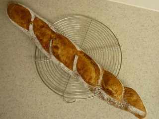 本日、バゲットを焼いた。 自家製酵母(レーズン種)を使用、粉は「リスドォル」。 レシピは「自家製酵母のパン教室」の「バゲット」を参考にした。 今回は、コルドン・ブルーで習ったように丁寧に成形してみた。 250度で予熱し、生地の表面にたっぷり霧吹...