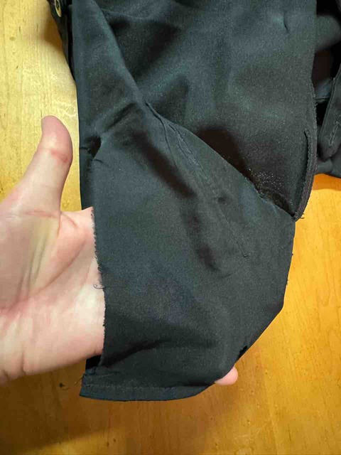会社の制服の「黒ズボン」。約5年前、スーパーバイザーに昇進したときに採寸して名入りで2本支給されました。 そのズボンの左ポケットに大穴があいたので補修しました。 左ポケットにはiPhone を入れていました。iPhoneの形に縦と横に破れていたので、それ... -