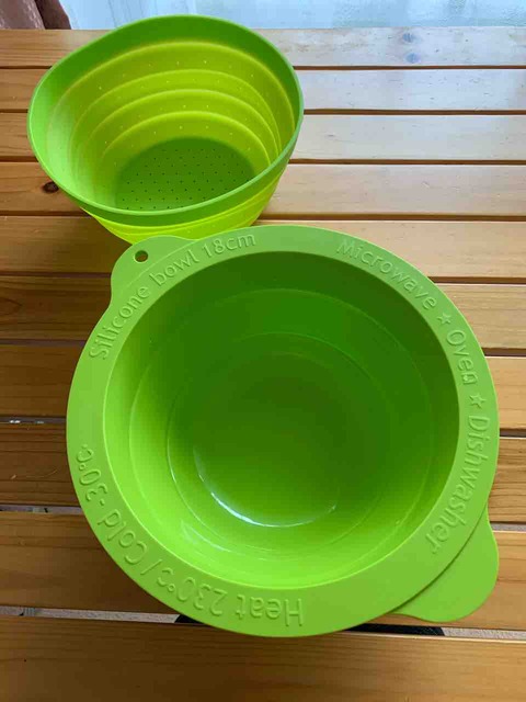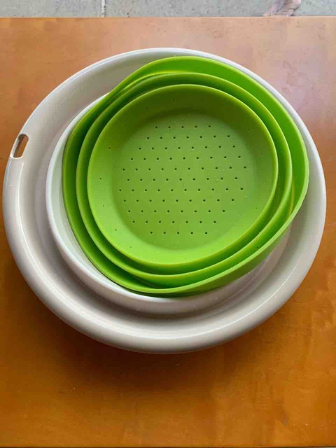 長期出張中に活躍しているのが、折りたたみできるザル&ボウルです。 Amazonで使いやすそうなサイズのものを買い求めました。 色と大きさが揃っていないのは悔やまれますが、このジャンルの商品でセット商品が少ないのと、シンプルな色合いのものはあまり...