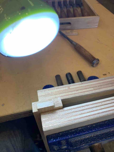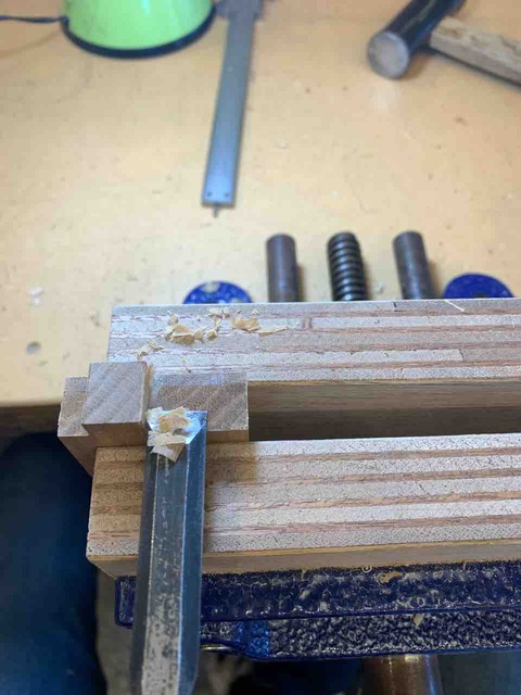 久しぶりの木工教室でした。 前回の様子 ホゾ加工は、鑿(のみ)を使い、毛引き線ぴったりに削ります。 慣れてきたので、桟のホゾ加工の正確かつ高速な処理方法を教えてもらいました。それは、毛引き線に鑿を当て、玄能でたたいて毛引き線付近の寸法を確定... -