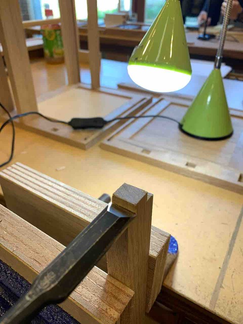 久しぶりの木工教室でした。 前回の様子 框組み(かまちぐみ)と桟(さん)のホゾの墨付けが終わったので、加工に入りました。 まず、ホゾ穴を角鑿(かくのみ)であけました。四角い穴をあっという間に開けられる角鑿は本当にすごいです。 地板をはめる細... -